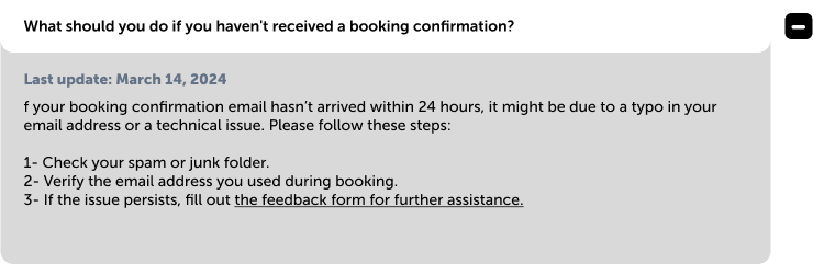 If an FAQ response might not fully resolve a user’s issue, offer clear options for contacting support. This can include links to chat, feedback form, email addresses and get in touch page.